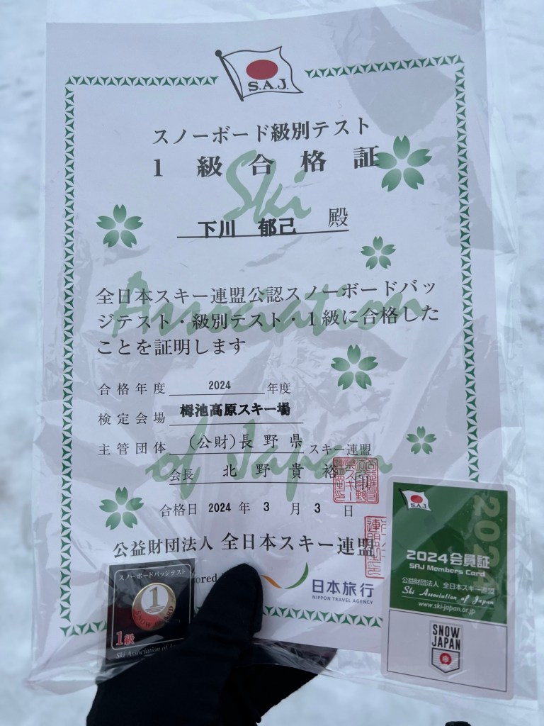おはこんばんにちはっ、IKUMI デス!(最近弟者兄者の影響が、、)ご報告が遅れましたが、3月3日にSAJ1級試験を長野県栂池高原スキー場で受験し、見事合格をいただきました!!🔥